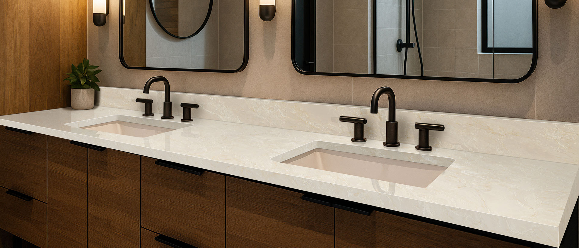 Inspired by natural Taj Mahal quartzite, this quartz showcases delicate wisps of gold and blonde veining that create gentle movement.