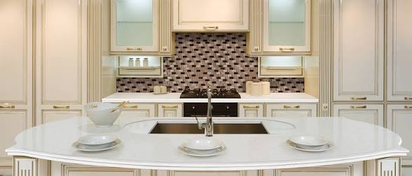 This quartz presents subtle gold and brown veining for a classically chic aesthetic.
