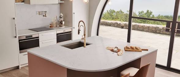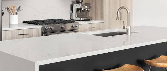 A sleek quartz with a marble-inspired look, showcasing light gray veining for a modern take on Italian marble.